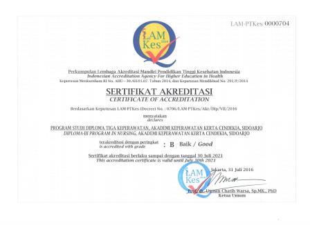 Akademi Keperawatan Kerta Cendekia telah Terakreditasi B , sesuai dengan Surat Keputusan Lembaga Akreditasi Mandiri Perguruan tinggi Kesehatan (LAMPT -Kes) Nomor 0706/LAMPT-Kes/Akr/Dip/VII/2016 dengan peringkat Akreditasi Program Studi "B" (Baik).